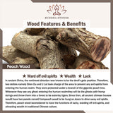 In ancient China, the northeast direction was known to be the devil's gate position. Therefore, two deities namely Shen Du and U Lei took charge of the area to prevent any evil spirits from entering the human realm. They were protected under a branch of the gigantic peach tree. Whenever they see any ghost entering the human realm they will tie the ghosts with hemp strings and throw them into a forest to be eaten by tigers. Since then, all ancient Chinese houses would have two panels carved from peach wood to be hung on doors to drive away evil spirits. Therefore, peach wood is considered to have the functions of luck, warding off evil spirits, and attracting wealth in traditional Chinese culture.